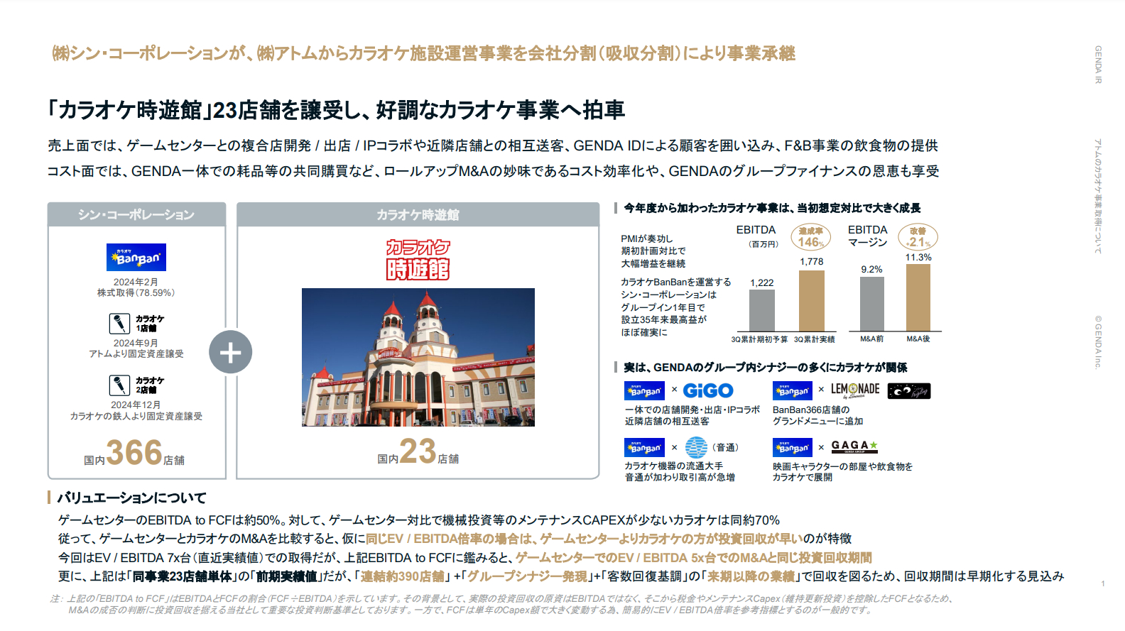アトムのカラオケ施設事業を会社分割の手法で事業を切り出し、GENDA子会社のシン・コーポレーションが事業を引き継ぐ。2025年2月下旬開催予定の承継会社の臨時株主総会で承認可決されることが条件となる。取得原価やのれんの金額は精査中。