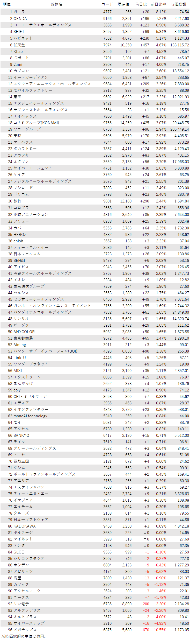 こうしたなか、ゲーム・エンタメ関連企業をみると、登録されている96銘柄のうち、上昇は80銘柄(83%)、下落は13銘柄(14%)、変わらずは3銘柄(3%)で、上昇した銘柄のほうが多かった。
