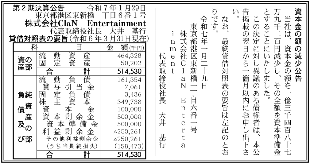 ClaN Entertainmentが資本金を1億3400万円減らして全額を資本準備金に振替を行う。1月29日付の「官報」に掲載された「資本金の額の減少公告」で判明した。