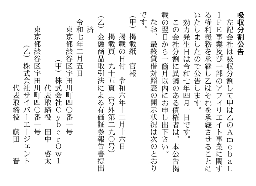 2月5日付の「官報」に「吸収分割公告」が掲載されていた。