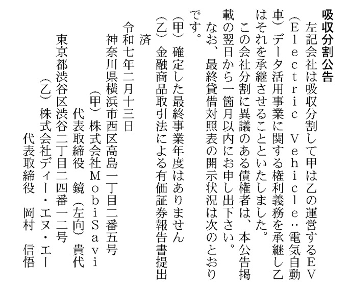 本件に関して2月13日付「官報」に「吸収分割公告」が掲載されたので追記しておく。。