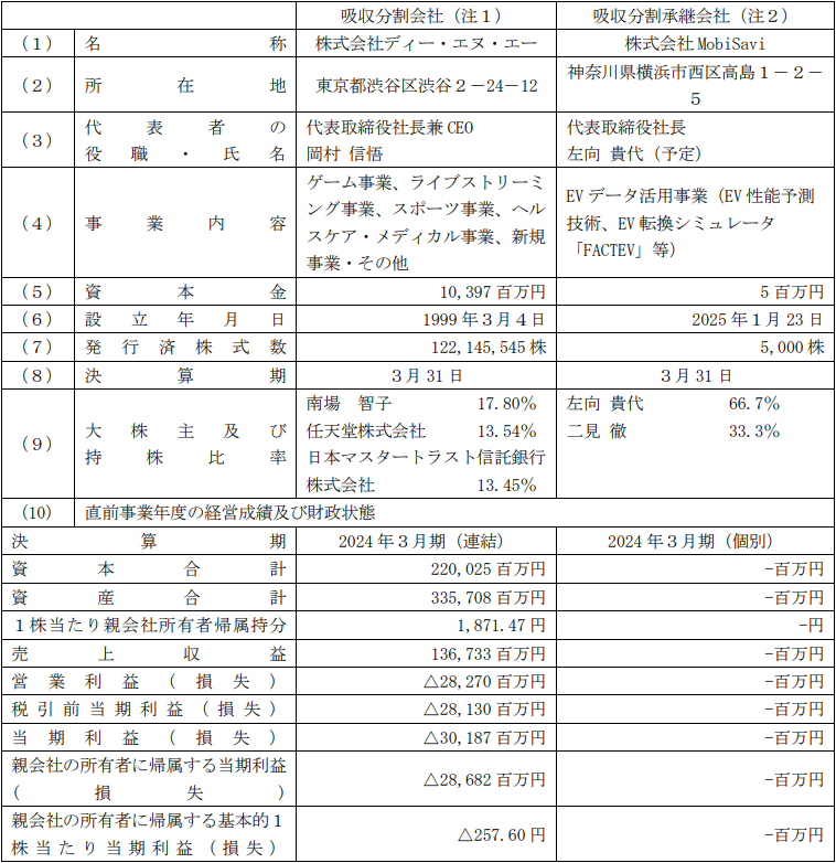 ディー・エヌ・エー(DeNA)<2432>は、この日(1月29日)、EV(Electric Vehicle: 電気自動車)データ活用事業を簡易吸収分割の方法により、 株式会社MobiSaviに対し移管すると発表した。DeNAは、対価として、MobiSaviの普通株式500株の交付を受ける予定だ。