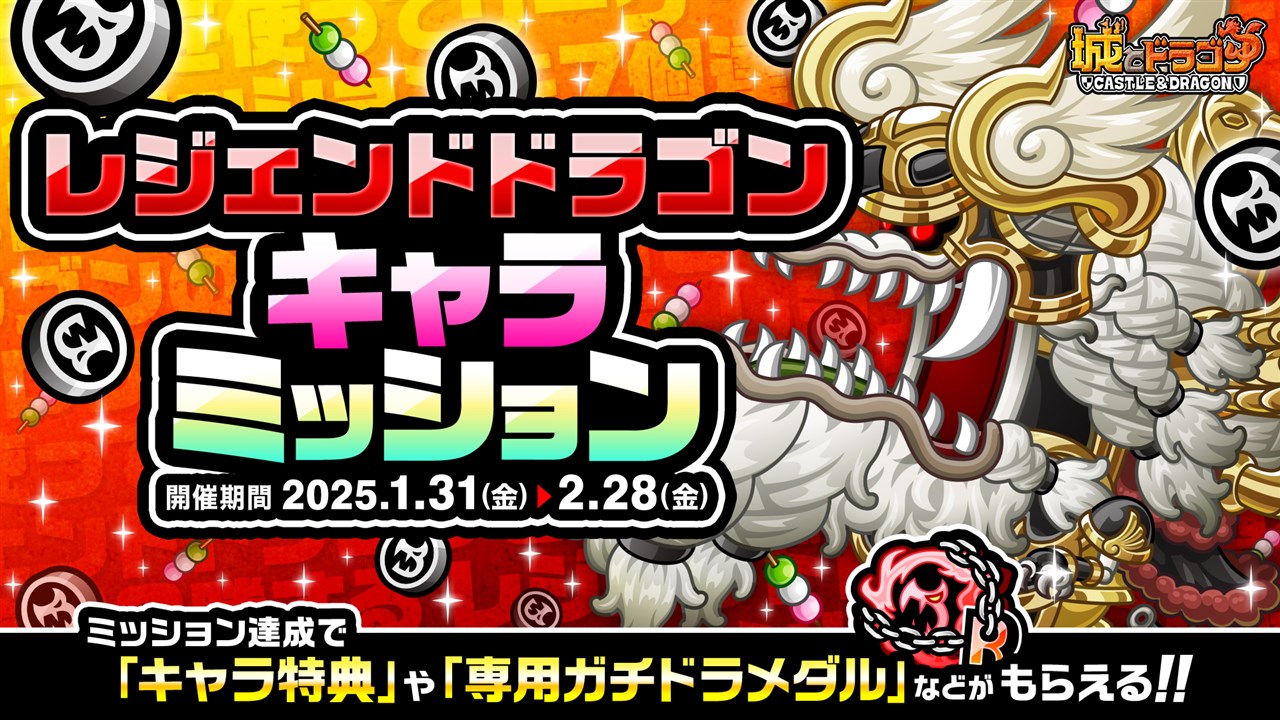 「レジェンドドラゴンを入手」など、用意されたさまざまなミッションを達成するとドラゴンメダル最大100枚や「きびだんご」最大400個、「専用ガチドラメダル」最大7枚を獲得することができる。また、規定数ミッションをクリアすると、レジェンドドラゴンの限定お着替えとエクストラボイスがセットになった「キャラ特典」がもらえる。