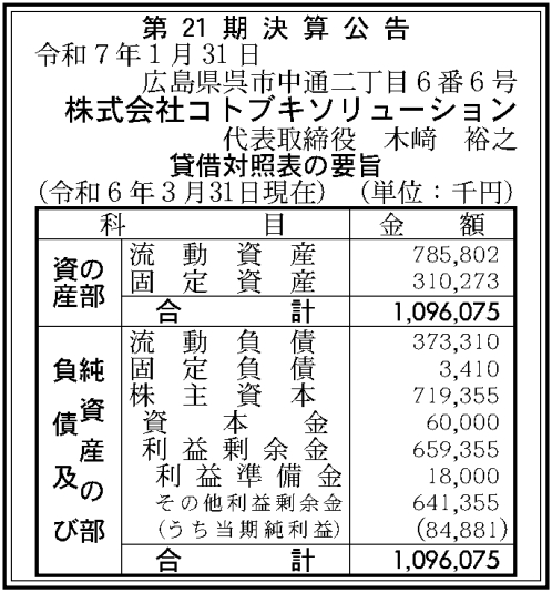 コトブキソリューションの2024年3月期(第21期)の決算は、最終利益が8400万円だった。1月31日付の「官報」に掲載された「決算公告」で判明した。