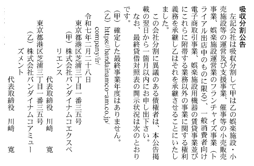 2月25日付け「官報」に「吸収分割公告」が掲載された。