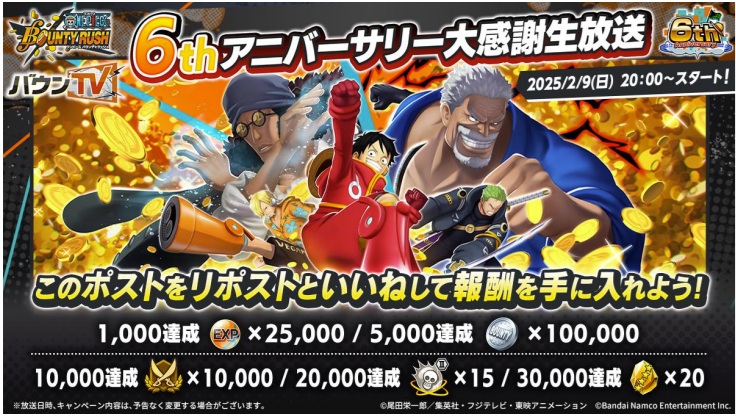 バンダイナムコエンターテインメントからApp Store/Google Playで配信中のスマートフォンアプリ『ONE PIECE バウンティラッシュ』の配信企画として、日本時間の2月9日(日)20:00より6thアニバーサリー大感謝生放送の配信が決定したことを発表した。