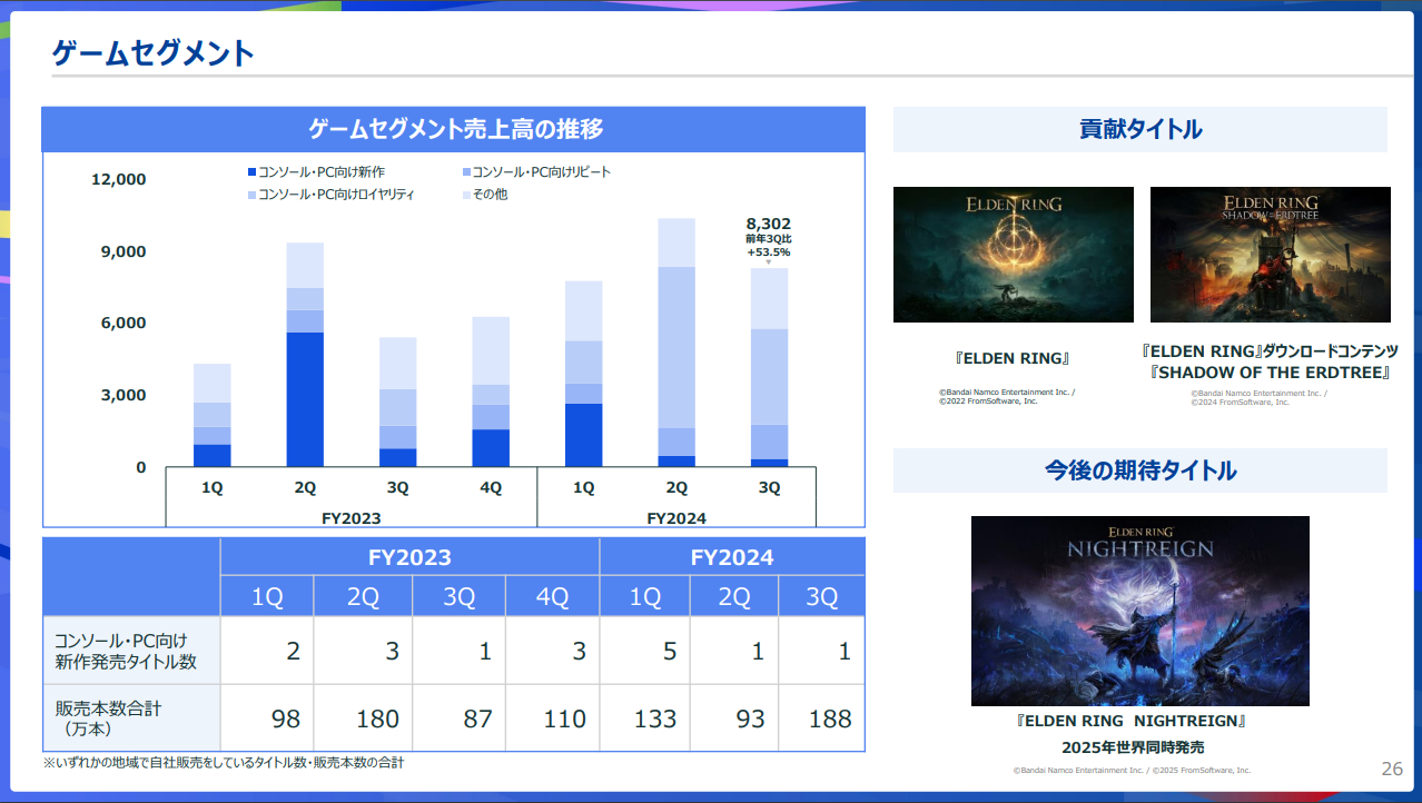 同社によると、子会社フロム・ソフトウェアが発売した『ELDEN RING』のDLC『ELDEN RING SHADOW OF THE ERDTREE』の国内外の販売が好調に推移した、としている。さらに本編のリピート販売も30%伸びた。ゲーム販売本数は同13.4%増の414万本だった。