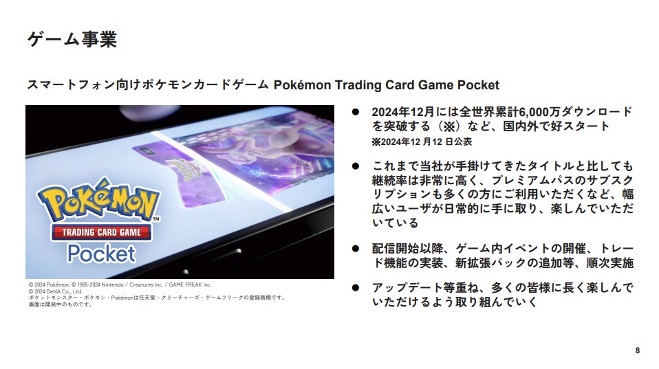 業績のけん引役となった『Pokémon Trading Card Game Pocket(ポケポケ)』は、2024年10月30日より、150の国と地域で正式サービスを開始しているが、そのグローバルでのヒットぶりがあらためて浮き彫りになったと言える。