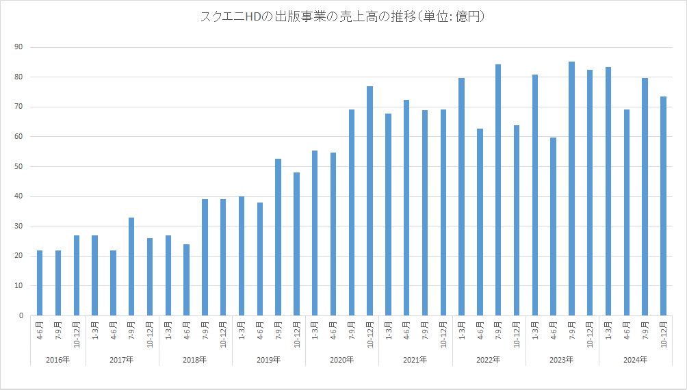 スクウェア・エニックス・ホールディングス<9684>は、第3四半期の出版事業の業績について、売上高が前年同期比2.2%減の222億3600万円、営業利益が同11.3%減の79億1600万円と減収減益だったと発表した。