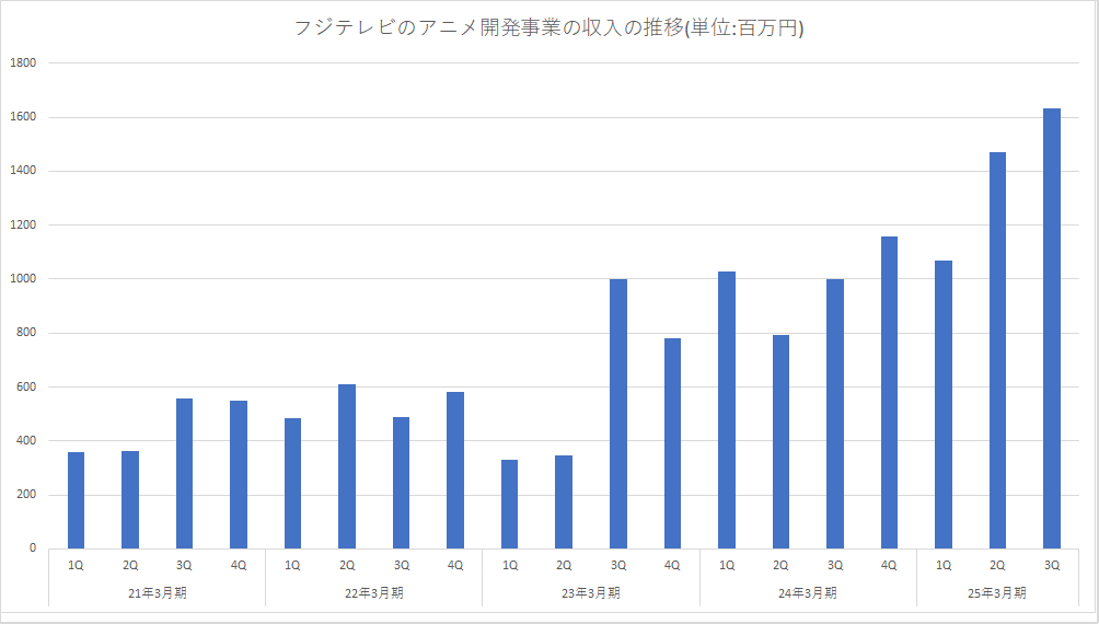 フジ・メディア・ホールディングス<4676>は、第3四半期累計の決算で、子会社フジテレビのアニメ開発事業の収入が前年同期比48.0%増の41億7400万円だったと発表した。第3四半期(24年10~12月)だけを見ると、前年同期比63.0%増の16億3300万円と過去最高となったようだ。
