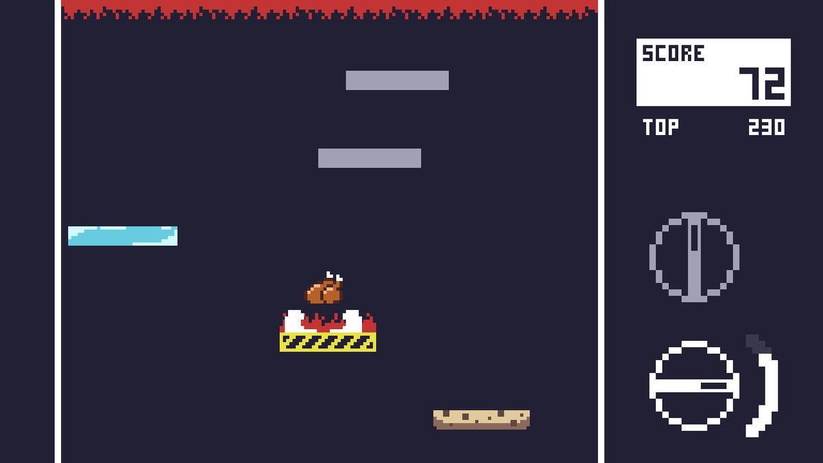 本作は、主人公のチキンがローストチキンになってしまわないように、オーブンの塔を下っていくカジュアルアクションゲーム。エンドレスに続く塔で、迫りくる炎から逃げながら様々な足場を乗り移っていく。