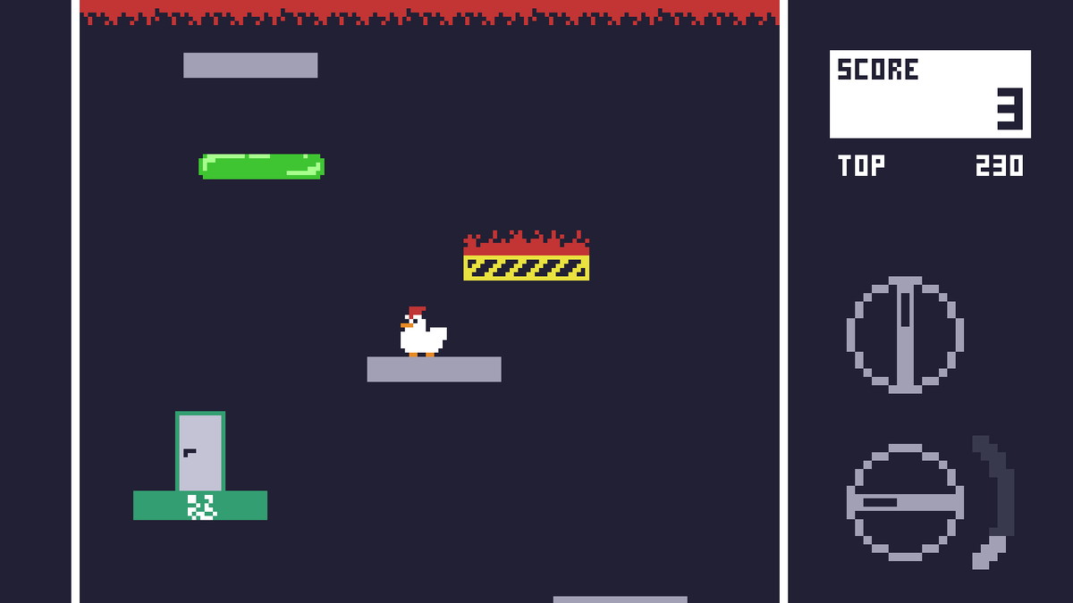 チキンをローストチキンにしようと、炎が迫ってくる。飛べないチキンが奈落に落ちてしまわないよう、足場を乗り移りながら塔を下っていきたい。