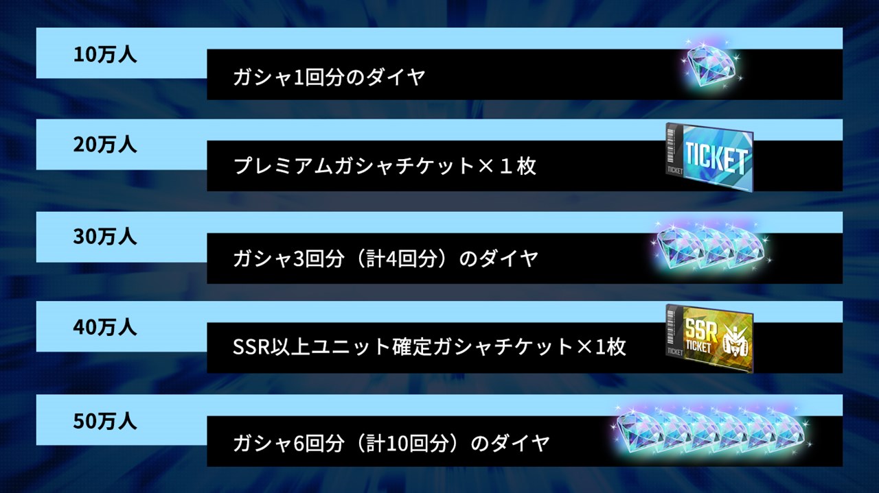 累計の事前登録者数に応じて、サービス開始後もれなく全員に配布される報酬が決まる事前登録キャンペーンを開催する。強化素材やダイヤなど、プレイに役立つアイテムをラインアップしている。事前登録をしてキャンペーンに参加しよう。