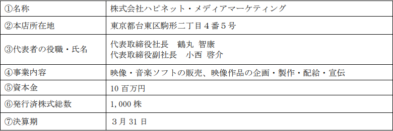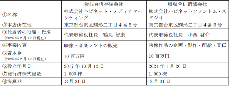 ハピネット<7552>は、この日(2月12日)、完全子会社であるハピネット・メディアマーケティングが存続会社として、ハピネットファントム・スタジオと4月1日付けで合併すると発表した。ハピネットファントム・スタジオは解散となる。ただ、「ハピネットファントム・スタジオ」は映像製作・劇場配給のレーベル、ブランド名として今後も存続する。