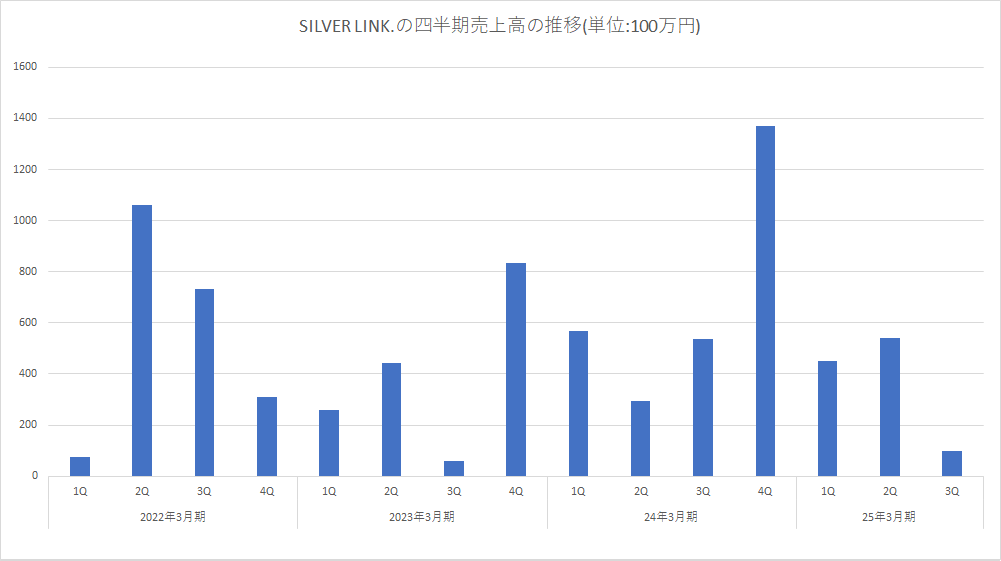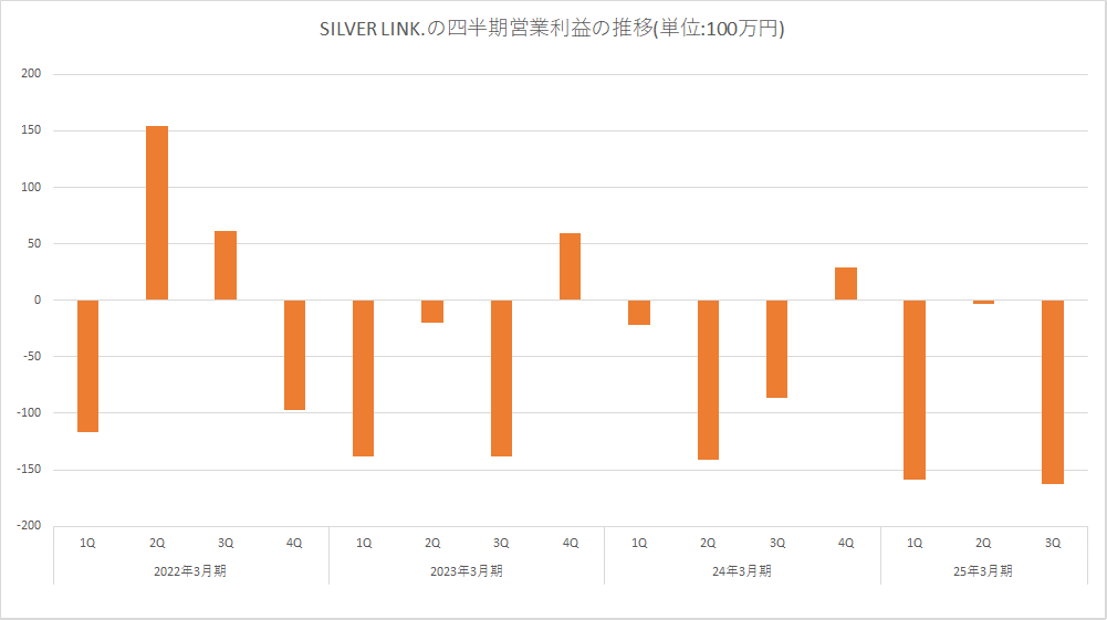 SILVER LINK.の2025年3月期 第3四半期累計(24年4~12月)の決算は、売上高が前年同期比22.2%減の10億8800万円、営業損失3億2500万円(前年同期は2億4900万円の損失計上)と減収・赤字幅拡大となった。