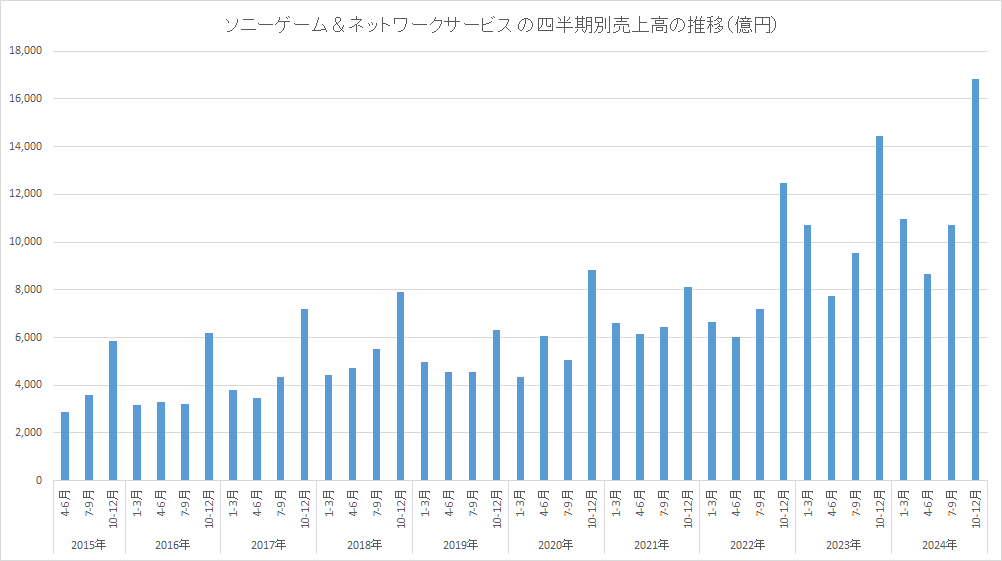 ソニーグループ<6758>は、第3四半期(2024年10~12月)のゲーム&ネットワークサービス分野の業績について、売上高が前年同期比16%増の1兆6823億円、営業利益が同37%増の1181億円と大幅増益を達成した。売上は過去最高、営業利益は第3四半期として過去最高だったという。