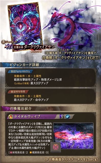 2月13日メンテナンス終了後より、新 UR ビジョンカード『狂瀾水禍 ダークリヴァイアサン』が登場した。さらに、『狂瀾水禍 ダークリヴァイアサン』が手に入りやすくなるピックアップ召喚を開催中。