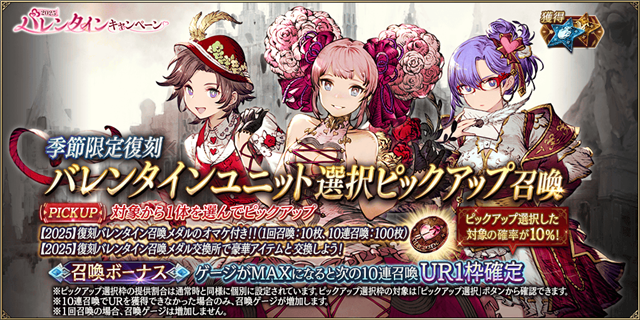 2月13日メンテナンス終了後より、2025 バレンタインキャンペーンとして「季節限定復刻 バレンタインユニット選択ピックアップ召喚」が開催中。