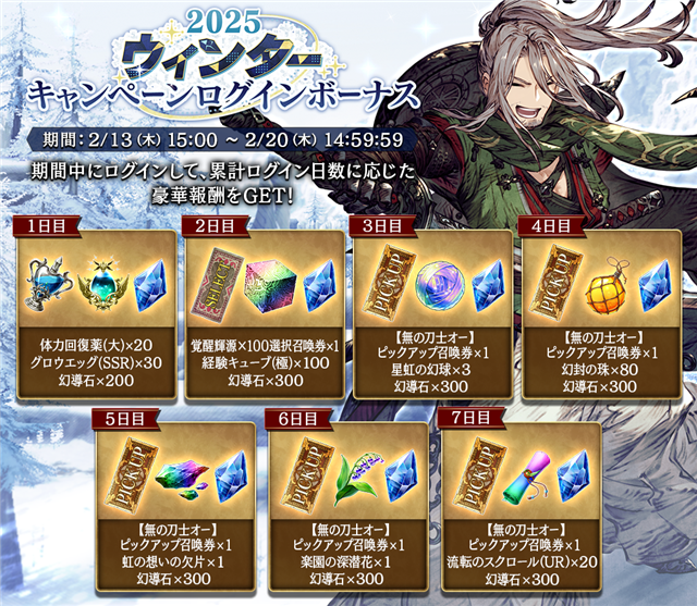 2月13日メンテナンス終了後より、2025 ウィンターキャンペーンとして幻導石や「【無の刀士オー】ピックアップ召喚券」などがもらえる期間限定ログインボーナスが開催中。