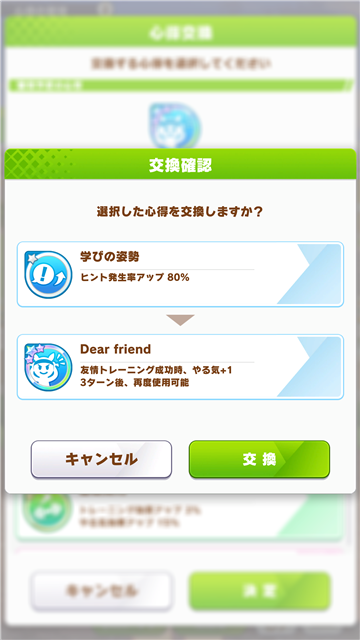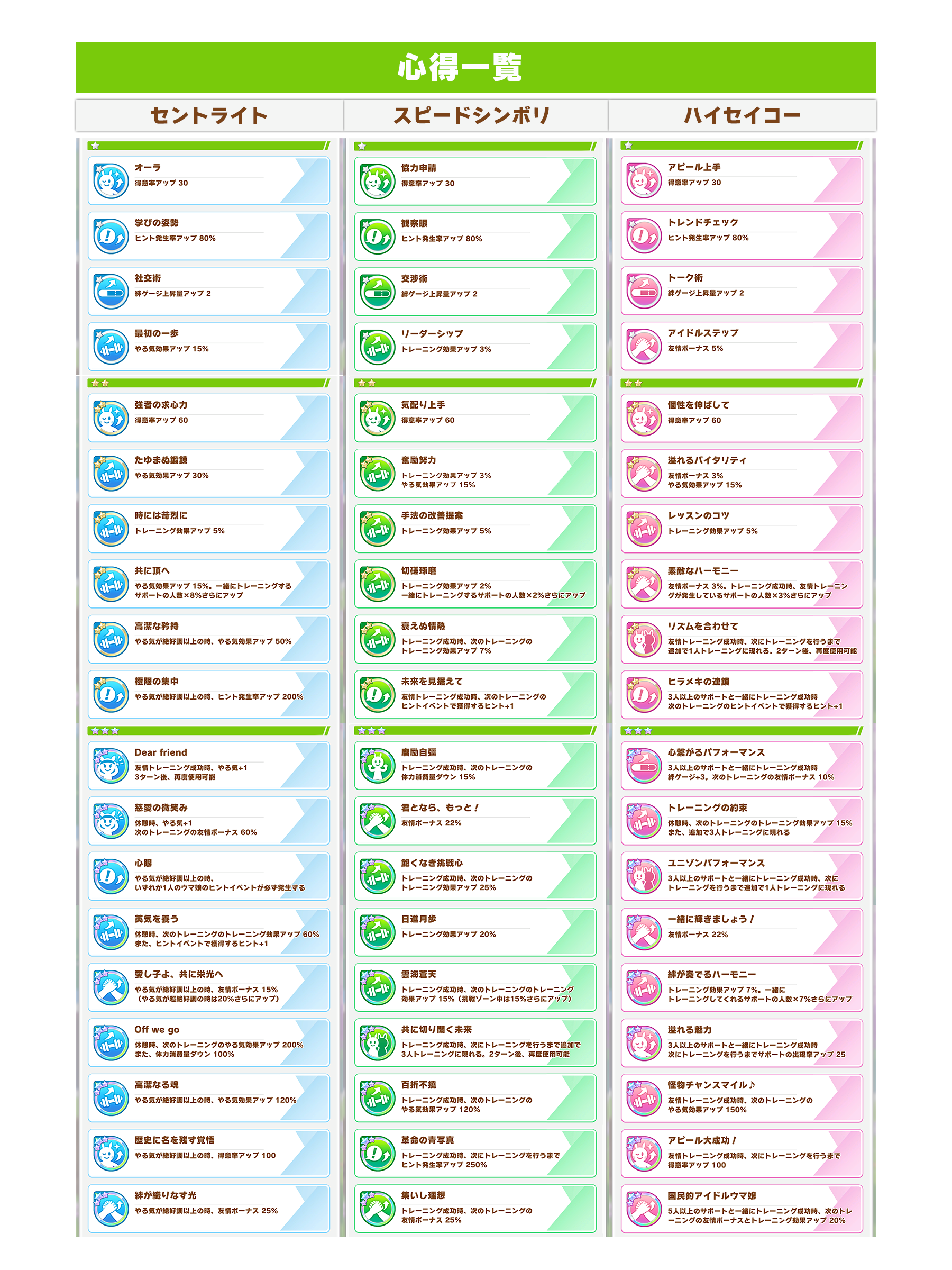 気になる「心得」の効果だが、得意率やヒント発生率、トレーニング効果、やる気効果などがアップするものが揃っている。「心得」は★1~★3までのレアリティがあり、育成を進めるごとにレアリティ(&効果)の高いものを選べる仕様だ。