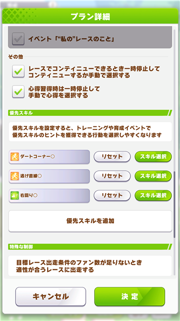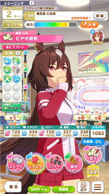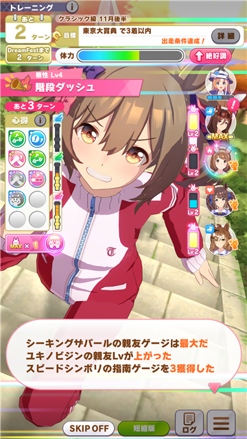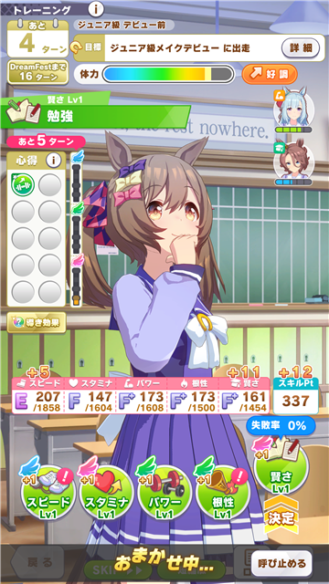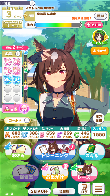 育成中に「おまかせボタン」を押すと、自動で育成が進むモードへ突入。最速スキップ状態でガンガン育成が進む。スキルヒント重視、パラメータ重視など育成の方針も細かく設定できるため、使い慣れれば自動でそれなりに強いウマ娘を育成することも可能だ。