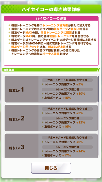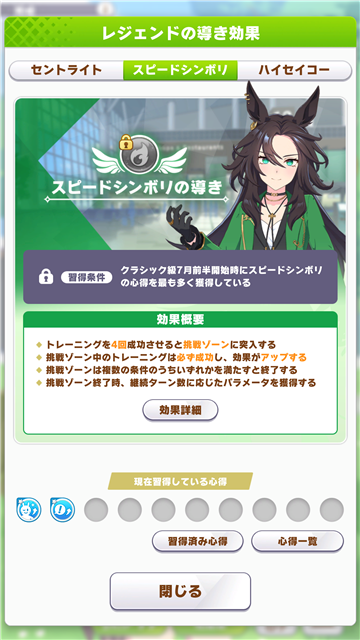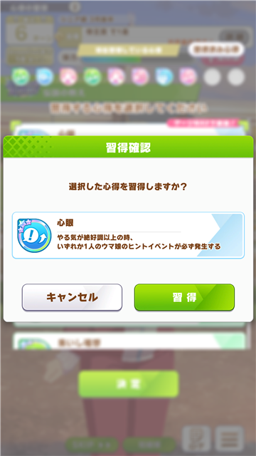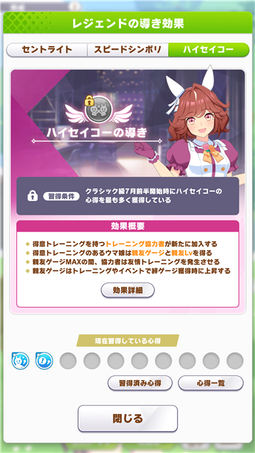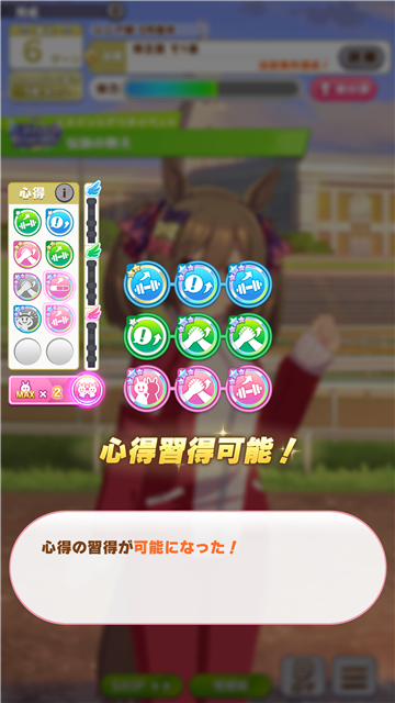 今回は、通常トレーニングの実行、もしくはイベントなどで「指南ゲージ」が溜まっていく。「指南ゲージ」はレジェンドウマ娘に紐付いた3種類用意されており、それぞれ一定値に達する事で6ターン毎に新たな「心得」を1つ習得できる。