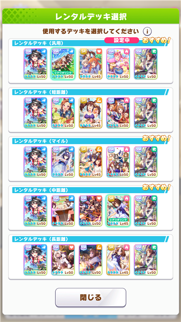 サポートカードが揃っていない……というトレーナー向けに、新たにレンタルデッキが追加される。こちらは汎用や距離別にカードを編成した5種類のレンタルデッキが使用可能となる。新規勢、復帰勢の方にオススメだ。