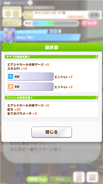 育成中にイベントが発生した際、選択肢ごとの効果がゲーム中で確認できるようになる。絆ゲージ、やる気、各パラメータ、体力などの増減、得られるスキルなど、すべてが確認可能だ。
