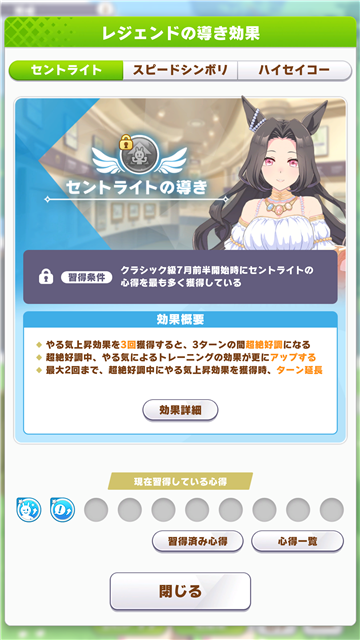このほかにも「レジェンドの導き」の効果はあり、クラシック級7月前半開始時までにどのレジェンドウマ娘の導きを習得するかが、育成方針の鍵を握る。