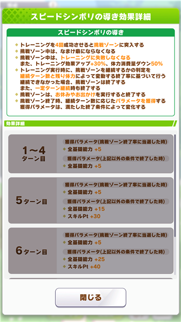 例えばセントライトなら、「やる気上昇効果を3回獲得する」と、やる気によるトレーニング効果がアップする「超絶好調」になる。スピードシンボリなら「トレーニングを4回成功させる」ことで、トレーニングが必ず成功し、効果がアップする「挑戦ゾーン」に突入する。ハイセイコーなら、「得意トレーニングを持つトレーニング協力者が新たに加入する」といった具合だ。