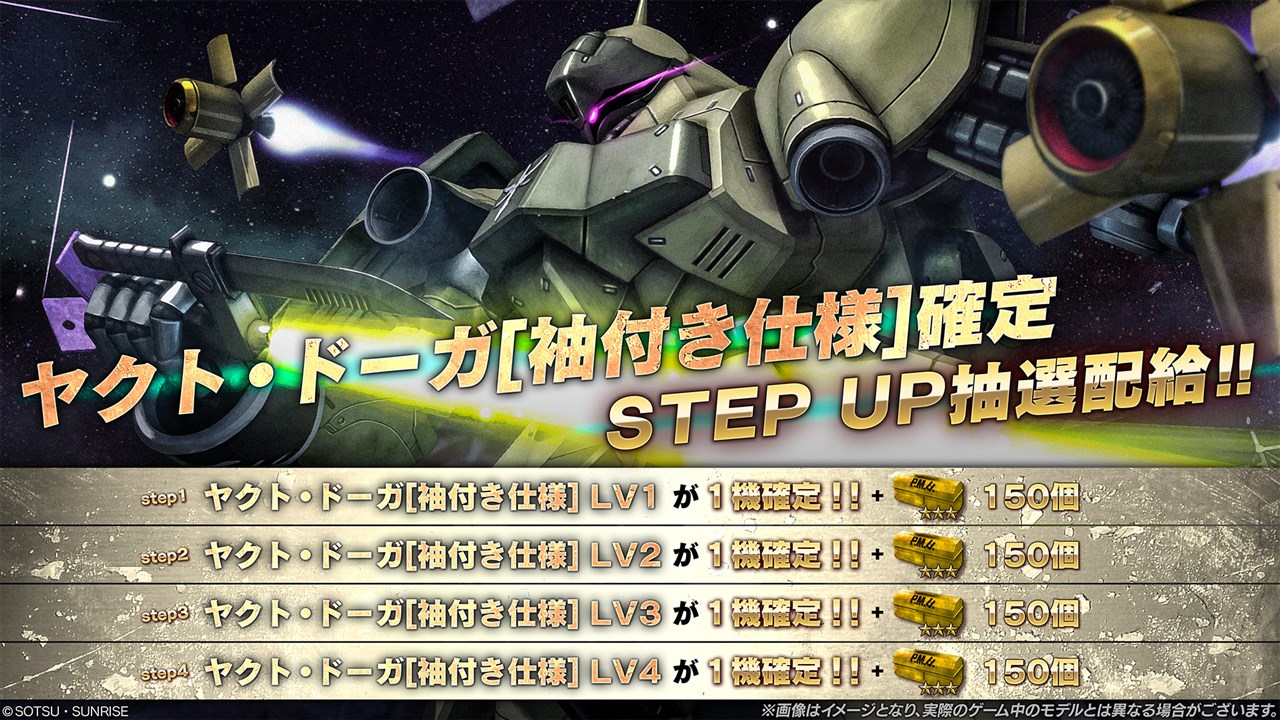 本日より、STEP数に応じたLVの「ヤクト・ドーガ[袖付き仕様]」が確定するSTEP UP抽選配給を開催する。さらに、各STEPのおまけで★3改修キット150個が手に入る。