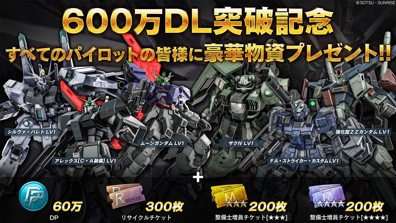 600万DLを記念して、毎日1回無料のスペシャル抽選配給を開催する。最新ラインアップの★2以上レアリティのMSが最大21機獲得できるお得な抽選配給となっている。