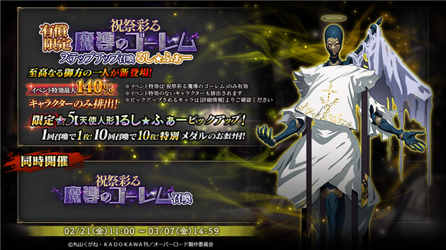 『有償限定『祝祭彩る魔導のゴーレム』ステップアップ召喚-るし★ふぁー-』では、新登場のコラボ限定★5キャラ【天使人形】るし★ふぁーをピックアップする。STEP8でコラボ限定★5キャラ【天使人形】るし★ふぁー1体が確定!イベント『祝祭彩る魔導のゴーレム』ではボーナス最大「140%」を所持している。