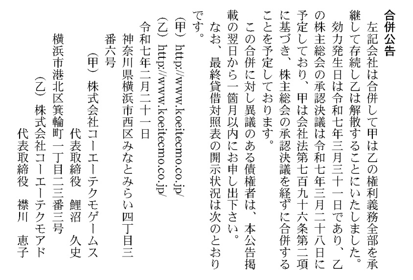 コーエーテクモゲームス、コーエーテクモアドを吸収合併 登記簿を取得して会社概要を調べてみた