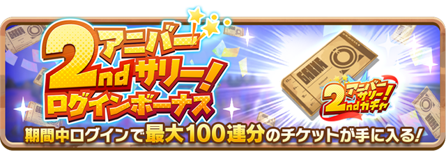 10日間ログインで最大100枚の「2ndアニバーサリーチケット」を獲得できるログインボーナスを開催する。チケットは「2ndアニバーサリー記念ガチャ」で使うことができる。