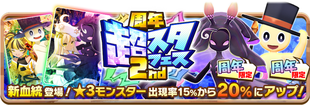 また、2周年を記念した「周年超スタフェス 2nd」では、新血統モンスターのイルミネ種「イルミネ」ゴースト種「ゴースト」に加えて、MR の新アシストカード「ステラ&セレネ」と「ミララ&オフリィ」、SSR「【ビンチョー】チャコール」が登場する。