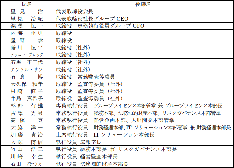 - 代表取締役会長 里見 治/代表取締役社長 グループCEO 里見 治紀