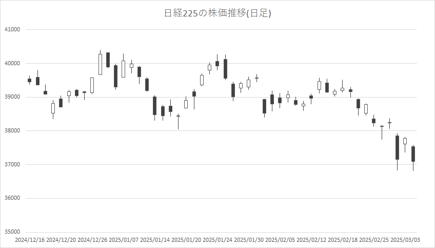 3月4日前場の東京株式市場は反落。日経平均株価は、前営業日比688円96銭安の3万7096円51銭で午前中の取引を終えた。一時950円を超える下落となる場面があった。前日の米国株式市場の下落に加えて、トランプ米大統領の円安を牽制するような発言をうけて円高傾向に動いたことが嫌気された。
