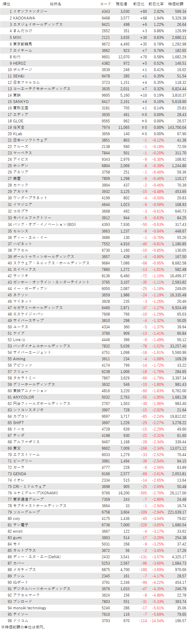 個別銘柄では、イオンファンタジー<4343>やKADOKAWA<9468>、エヌジェイホールディングス<9421>、まんだらけ<2652>が買われた一方、ドリコム<3793>、テイツー<7610>、monoAI technology<5240>、ブシロード<7803>が売られた。
