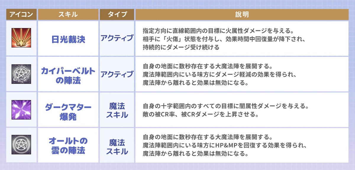太陽の力を自在に操り、紅蓮と雷元素の力を極めし、その強大な魔法で敵を焼き尽くす。さらに法陣の力を駆使して、近接戦闘でも圧倒的な強さを発揮する。