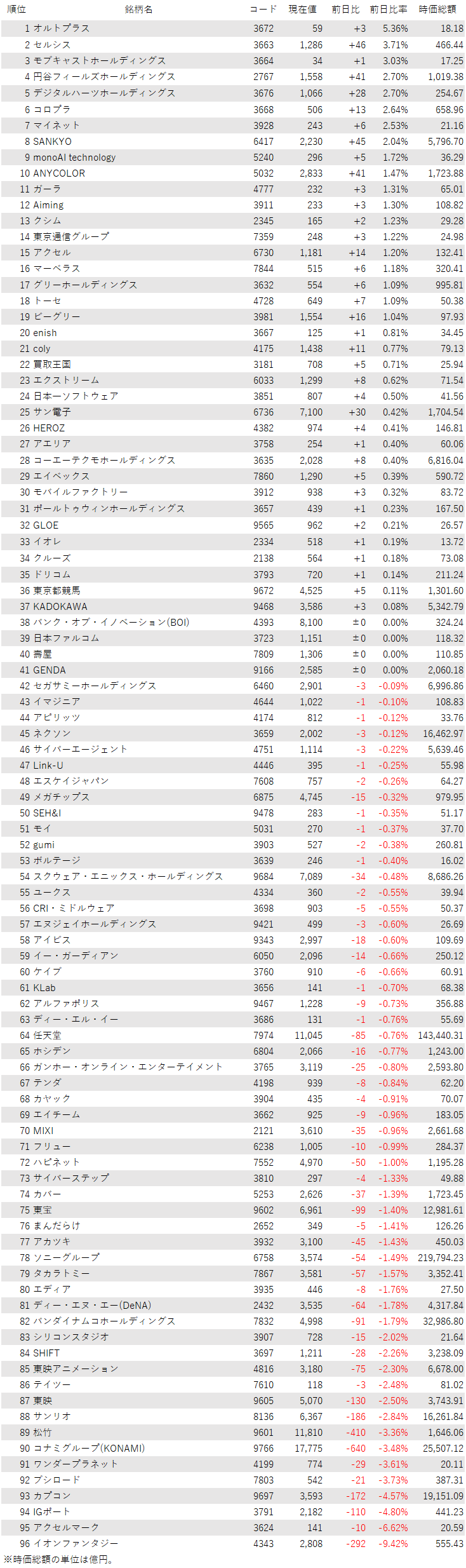個別銘柄では、オルトプラス<3672>やセルシス<3663>、モブキャストホールディングス<3664>、円谷フィールズホールディングス<2767>が買われた一方、イオンファンタジー<4343>、アクセルマーク<3624>、IGポート<3791>、カプコン<9697>が売られた。
