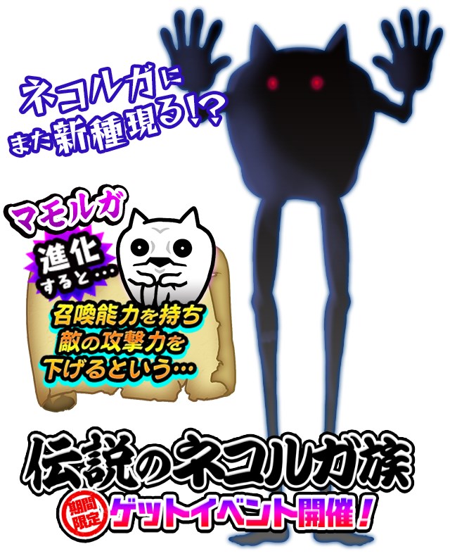 ネコなのか何なのか、まったく正体不明の一族が集結する「伝説のネコルガ族」に、新キャラクター「マモルガ」が参戦する。さらに今なら期間限定で超激レア確定キャンペーンも開催する。「11回連続ガチャ」を回せば超激レアキャラクターが必ず1体以上ゲットできる。