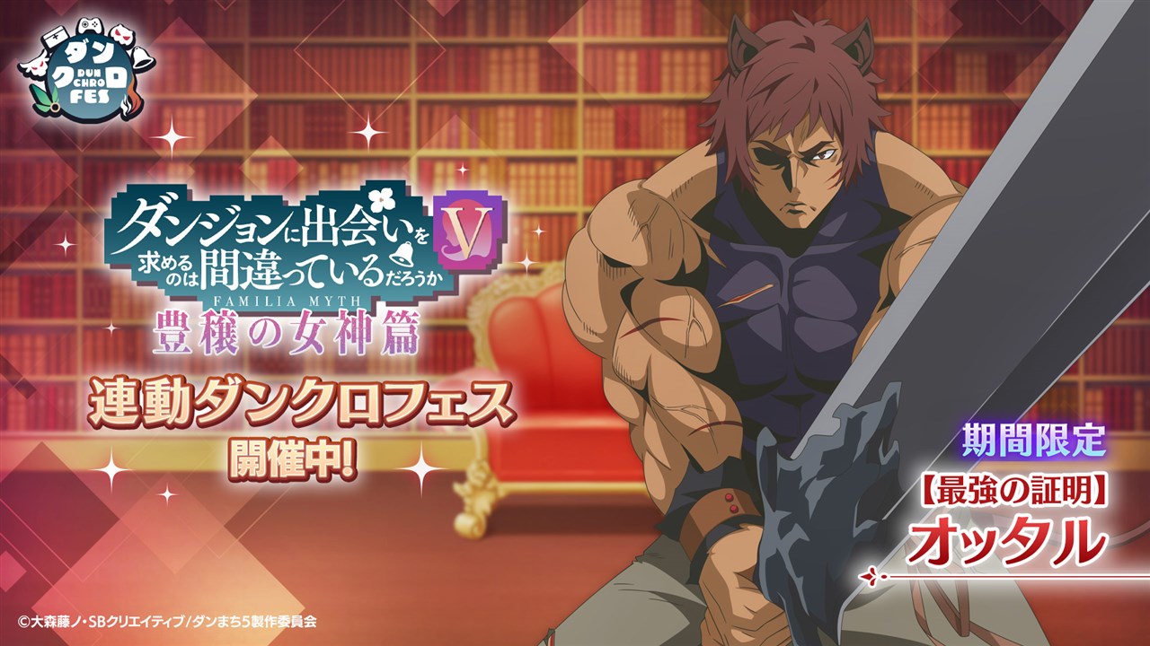 『ダンクロ』では現在、TVアニメ「ダンまちV」の放送を記念した10連無料ガチャを開催している。さらに、「ダンまちV」と連動してTVアニメで活躍した「オッタル」が新規キャラクターとして登場している。