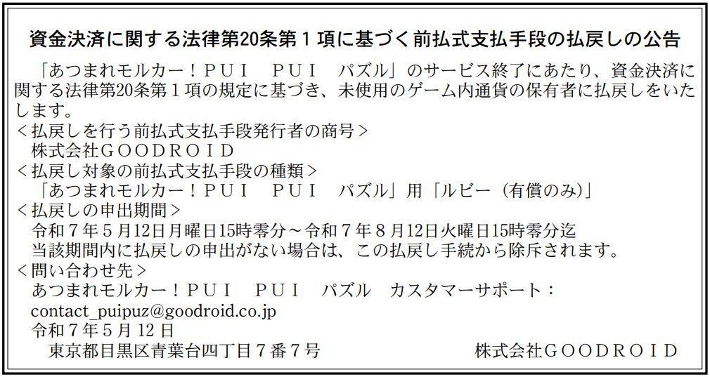 5月12日付の「官報」に資金決済法に基づく前払式支払手段の払戻しの公告が掲載された。