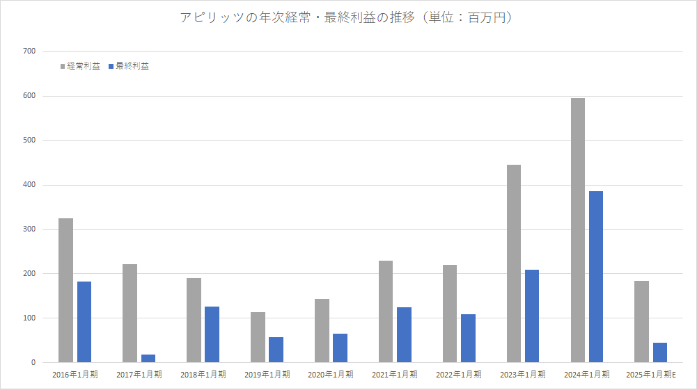 アピリッツ<4174>は、3月10日、2025年1月期連結業績予想の下方修正を行い、売上高90億0800万円(前回予想90億円)、営業利益1億8500万円(同3億0100万円)、経常利益1億8500万円(同2億9500万円)、最終利益4500万円(同1億5900万円)、EPS11.2円(同38.63円)とした。