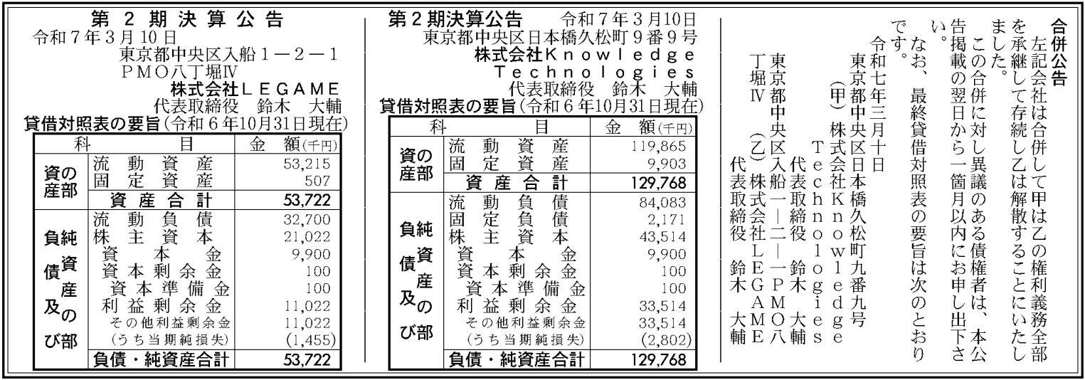 Knowledge Technologiesは、LEGAMEを吸収合併する。3月10日付の「官報」に掲載された「合併公告」で判明した。LEGAMEは解散する。