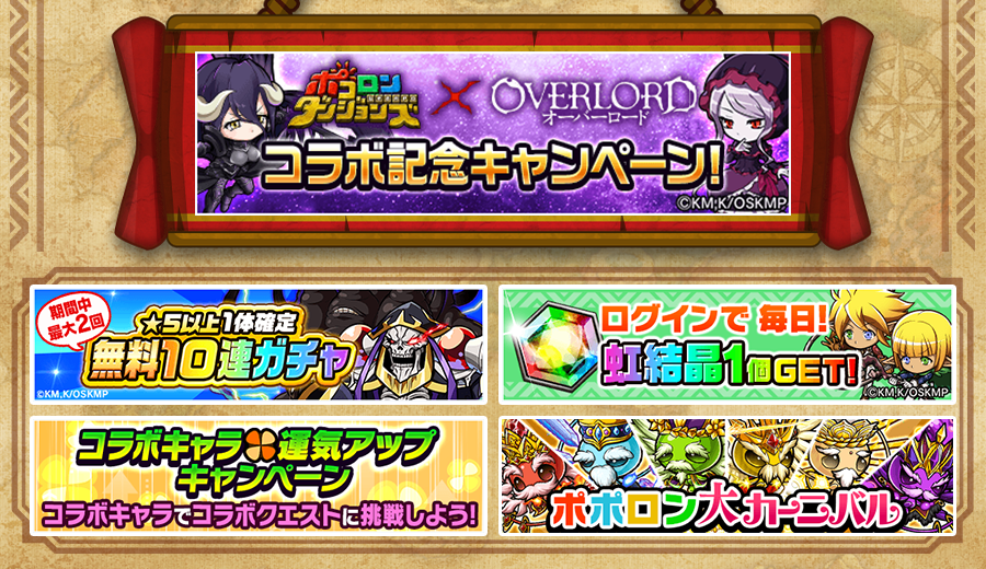 さらに、「虹結晶×50個」や「オーバーロードコラボスキルポポロン×1体」をはじめ、モンスターや装備のレベルアップに使える育成用の素材も手に入る。