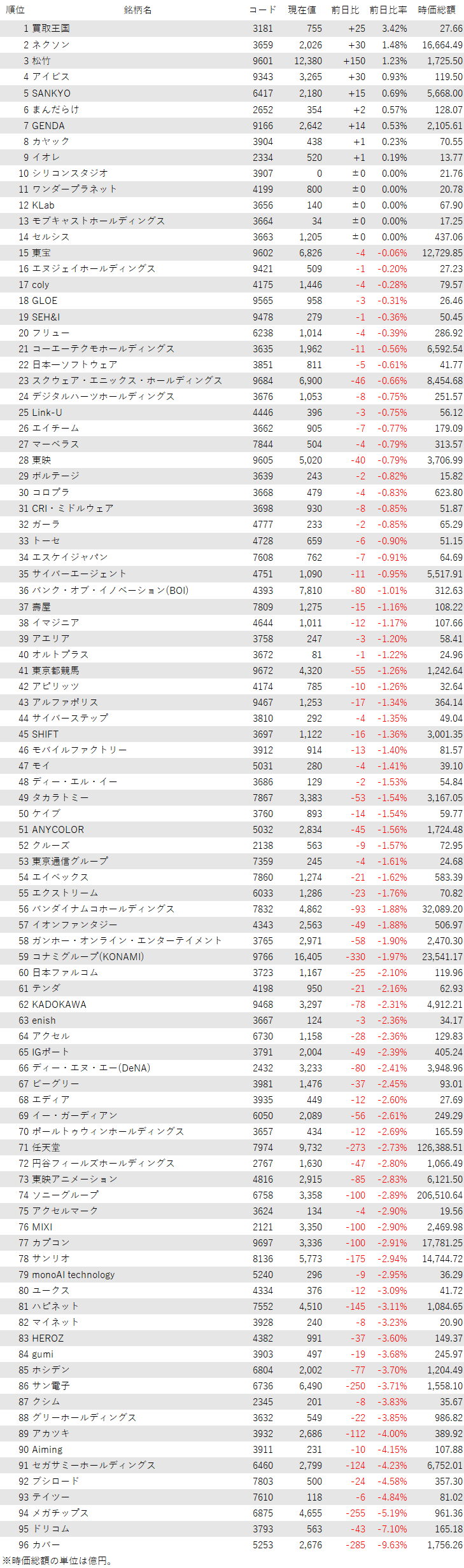 こうしたなか、ゲーム・エンタメ関連企業をみると、登録されている96銘柄のうち、上昇は9銘柄(9%)、下落は82銘柄(85%)、変わらずは5銘柄(5%)とほぼ全面安商状だった。