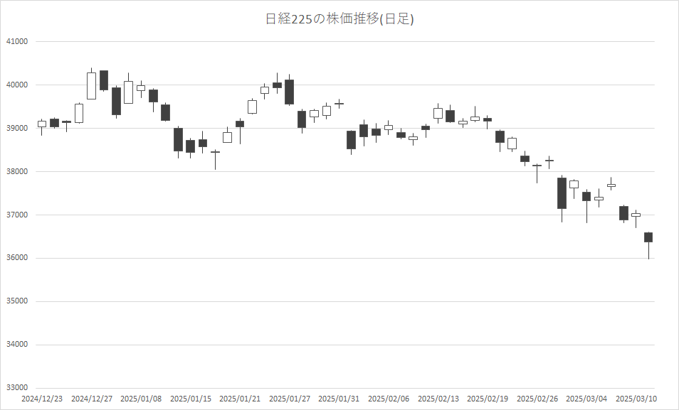3月11日前場の東京株式市場は反落。日経平均株価は、前営業日比645円70銭安の3万6382円57銭で午前中の取引を終えた。一時1000円を超える下落となる場面があった。米国の関税政策による景気悪化が懸念されており、ハイテク株を中心に売られた。前日の米国株式市場で主要3指標が急落した流れを引き継いだ。