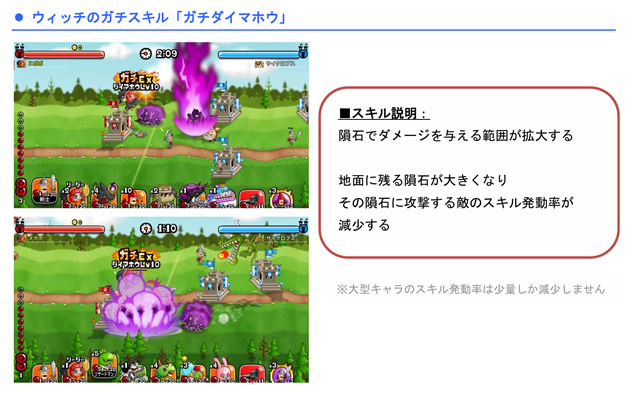 ガチスキルの実装に先駆け、ウィッチとクラーケンの通常スキルも改修!ウィッチの「ダイマホウ」は、空中のキャラ(※大型を除く)に当てた際に確率で地上に落とすことができるようになる。クラーケンの「イカスミ」は、スキルを受けたプレイヤーが画面に出る墨を雑巾で消すことが可能に。一方、「イカスミ」でダメージを受けたキャラは、「通常攻撃が確率で失敗する」状態異常が付与される。それぞれのスキル改修については3月14日メンテナンス後よりゲーム内に反映される予定。